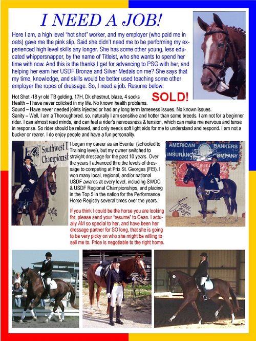 - '03 Dutch Warmblood filly by Wellington (keur Dutch Warmblood stallion from Holland, by the legendary sire, Nimmerdor) out of our First Premium, Dutch approved, and # 3 TB mare in North America, Ol Lady Express. Each of Wellspring’s 5 siblings has earned at least 1 USDF Horse of the Year award, either for the Sporthorse Breed shows, or Dressage shows. Wellspring made her own name at the USDF Breed shows. She earned Grand Champion Filly of 2003 with a 79.4% from Hilda Gurney, which was the second highest score of the entire USDF Breed Show! Judges' comments include: "Beautiful filly, lovely type. Elegant, well developed. Nice condition and muscling. Good legs and feet. Correct. Nice swinging walk with good overstep. Nice long strides in trot. Nice expression!"At Wellspring's Dutch Warmblood keuring inspection she was awarded the prestigious First Premium rating. And she ended up the #5 USDF Sporthorse Horse of the Year for Fillies of 2003 (all breeds). Due to Cean’s life demands, Wellspring got a late start with consistent under saddle training. Cean debuted Wellspring in the fall of 2009 at the USDF competitions, showing her at Training level. Wellspring earned outstanding scores, with multiple scores in the 70’s, and as high as 73.214%. Wellspring is schooling First level at home.Wellspring is a sale horse here at Top Flight Farms. However, plans are to possibly breed Wellspring for a spring of 2011 foal. Stallion choice is still being researched. Cean would also like to get Wellspring more experience, and working and showing more consistently before putting her on the general market for sale. You are welcomed to inquire about Wellspring’s progress and sale status. Please visit our “Latest News” page for more photos and show results for Wellspring. | ||