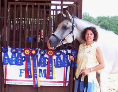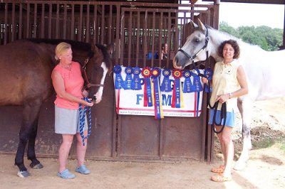 After such a successful Training Level season last year, Titleist (by Idocus) moved up to First Level in 2007, and had his debut at the Dallas Dressage Club's set of USDF Shows in Athens, TX the weekend of July 28 & 29. After forgetting the test pattern in their first ride (and during a X 2 movement!), Cean got a caller for the rest of the tests that weekend. They then won those 3 classes with scores of 68.333%, 68.667%, and a 70.556%. Needless to say, Titleist was named the First Level Champion both days of these USDF shows. He also led his team, "The Mixers," to the 2007 USDF Region 9 Adult Team Championship.As seen in this photo, other Top Flight Farms' horses also took home more than their fair share of the blue ribbons. At left is Valerie Young and Upon Eagles Wings (by Zeoliet, bred by Top Flight Farms), who won a couple of his Training level classes. Not pictured is Hot Shot, who Cean showed Prix St. Georges, and who was awarded a couple of blue ribbons as well. Cean and Titleist are shown at right in this photo. | ||||