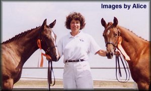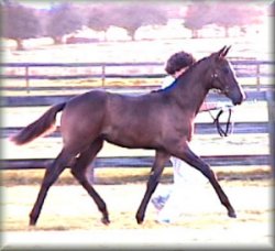 Shannon ('99 KWPN filly, Juventus x Ol Lady Express) continued her national ranking success with owner Kelly Davidson of Grayson, KY. In 2002 Shannon was named the #5 USDF Sporthorse Horse of the Year for 3 Yr Old Fillies (all breeds). In 2001 she was the #3 USDF Sporthorse Horse of the Year for 2 Yr Old Fillies (all breeds). In 2000 she should have been in the top five for yearlings, but miscommunication from show staff caused an error that prevented her from being named the USDF HOY that she deserved. Shannon is now being started under saddle and we can't wait to hear of her dressage successes in the future! | ||||