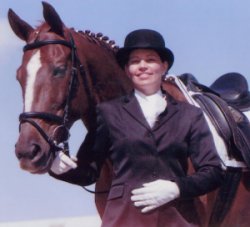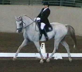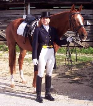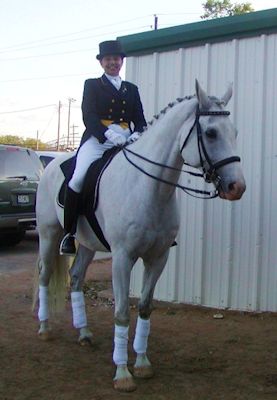 On the weekend of April 1, 2007 in San Antonio, TX, Cean rode Hot Shot down the centerline for their Prix St. Georges debut. It is not easy to train a Thoroughbred to FEI, and relatively few have achieved this high of level. Being a hot blooded and sensitive breed, it takes a lot of patience, persistence, and finesse to develop them into a horse that can compete at these upper levels. Hot Shot held his own in competition with the warmbloods, and even earned a score of 65% at PSG at this weekend of USDF showing. In his photo afterwards, even Hot Shot looked pleased with himself and is smiling! | ||||