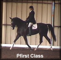Pfirst Class ('97 KWPN filly, Patrick x Ol Lady Express) finished her 2003 debut year of outstanding Dressage performances with a median score of 69.231% at Training Level. This earned her the honor of being the #1 Dutch Warmblood in the nation and her USDF Dressage Horse of the Year award. For overall Training Level (all breeds), PC placed #19 in the nation. She was also Top Five Training Level at the GAIG/USDF Region 9 Dressage Championships. We are very proud of PC, and look forward to a successful year at First Level in 2004! | ||||