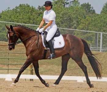 After a successful return to the show world in 2006 at Fourth Level dressage, Hot Shot (‘91 Thoroughbred gelding) continued developing his dressage skills, and competed at FEI, Prix St. Georges, in 2007. He ended the year as the Reserve National Champion USDF Dressage Horse of the Year at PSG/AA for the Performance Horse Registry. What a way to cap a long successful dressage career that started at Training level, and came up through each of the levels to FEI, for this special gelding! | ||||